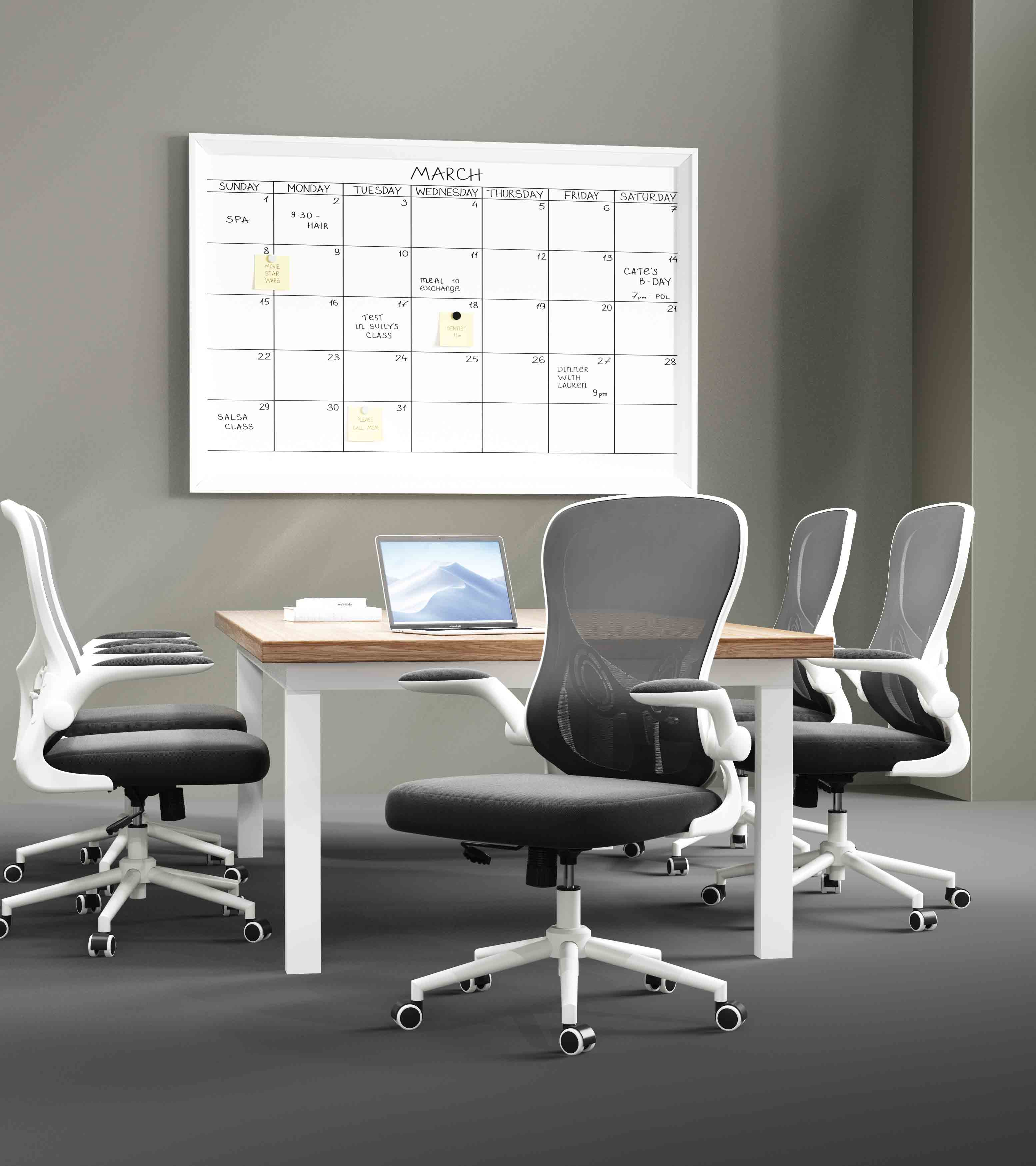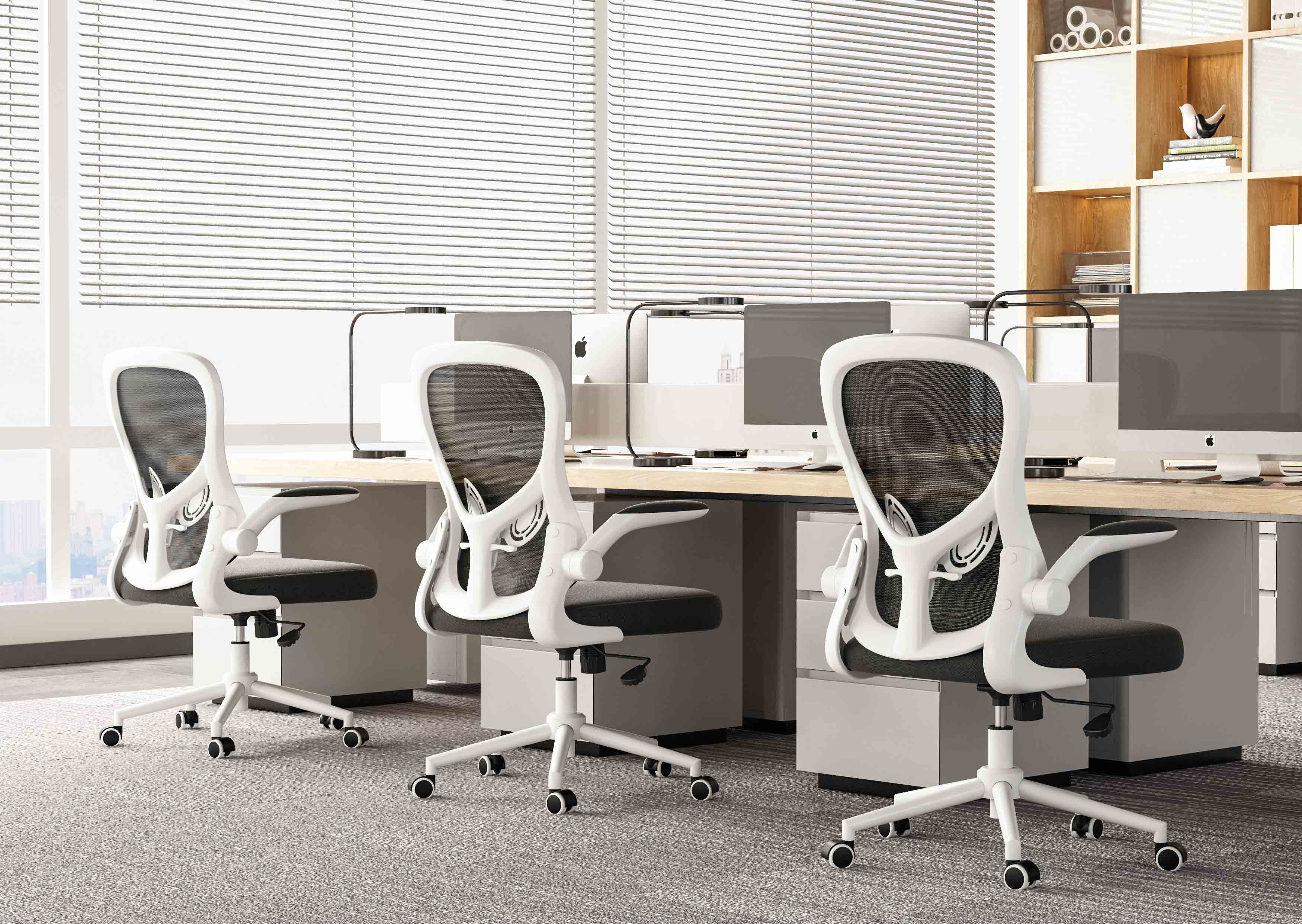 The mesh office chair is equipped with adjustable armrests. The armrests are wrapped in comfortable mesh and sponge, and the soft wrapping can reduce the pressure on the elbows. The armrest can be flipped up 90 degrees, can save one square meter by gently lifting it up. The office chair design of the flipped armrest can easily change the distance between you and the desk, saving space to the greatest extent. It can be used in living rooms, study rooms, and conferences room etc.