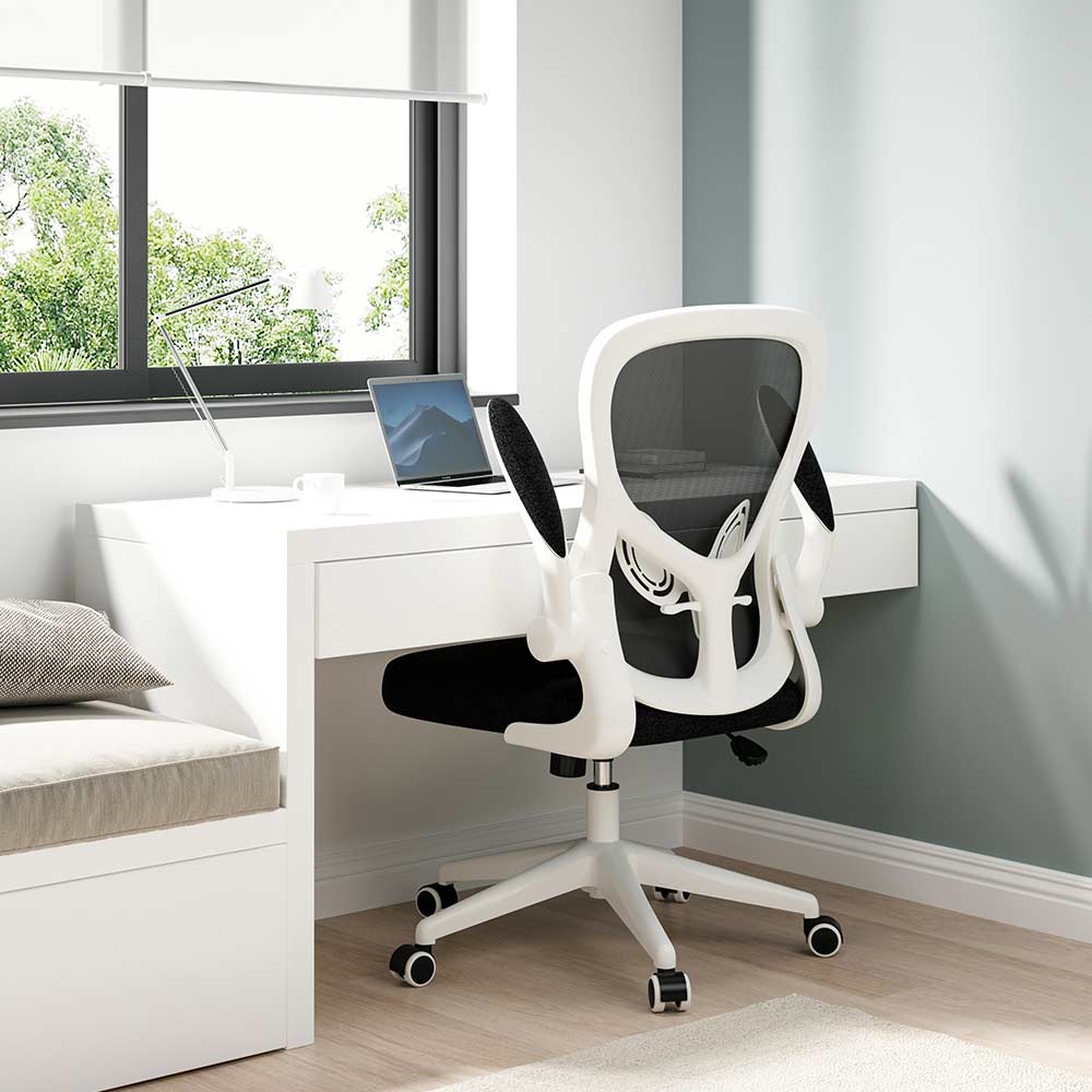The mesh office chair is equipped with adjustable armrests. The armrests are wrapped in comfortable mesh and sponge, and the soft wrapping can reduce the pressure on the elbows. The armrest can be flipped up 90 degrees, can save one square meter by gently lifting it up. The office chair design of the flipped armrest can easily change the distance between you and the desk, saving space to the greatest extent. It can be used in living rooms, study rooms, and conferences room etc.